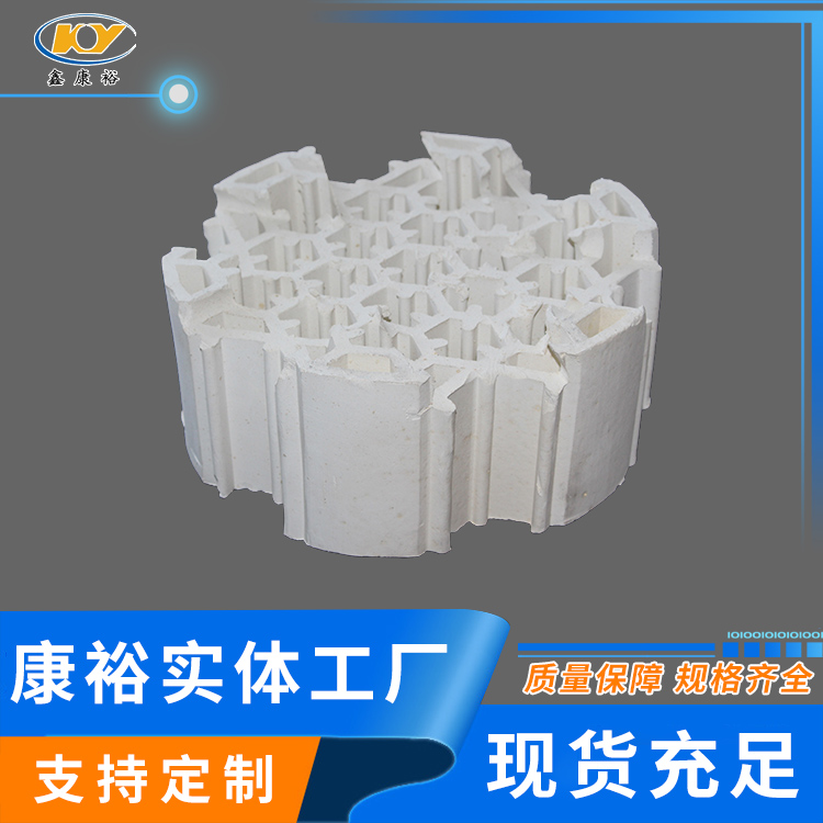 通過天津大學對輕瓷填料性能的測定表明,產(chǎn)品傳質(zhì)系數(shù)大,是其他填料的2.2倍。另外,輕瓷填料在裝填好后其相鄰填料只有6個支撐腿重疊為無效面積,而且氣液相傳的形式是‘面’接觸,再加上輕瓷填料系微孔蜂窩陶瓷,具有微孔面積和空間液滴面積,從而使得填料的有效面積大于99.5%,分離凈化效果。與之相反,全瓷填料、塑料填料以及金屬填料由于沒有微孔,吸附性能不好,液體在塔內(nèi)直流不掛液,滯留時間太短,氣液相傳的形式是‘點’或‘線’接觸,其使用效果明顯不如輕瓷填料。