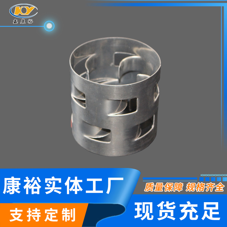 金屬鮑爾環填料是德 國BASF公司開發的采用金屬薄板沖制而成,在環壁上開出了兩排帶有內伸舌葉的窗孔。每排窗孔有五個舌葉,每個舌葉彎向環內,指向環心,在中心處幾乎相 搭,上下兩層窗孔的位置相互錯開,一般開孔的總面積約為整個環壁面積的35%左右,由于鮑爾環填料在環壁上開了許多窗孔,使得塔內的氣體和液體能夠從窗口 自由通過,目前鮑爾環填料是被采用的主要環形填料之一。